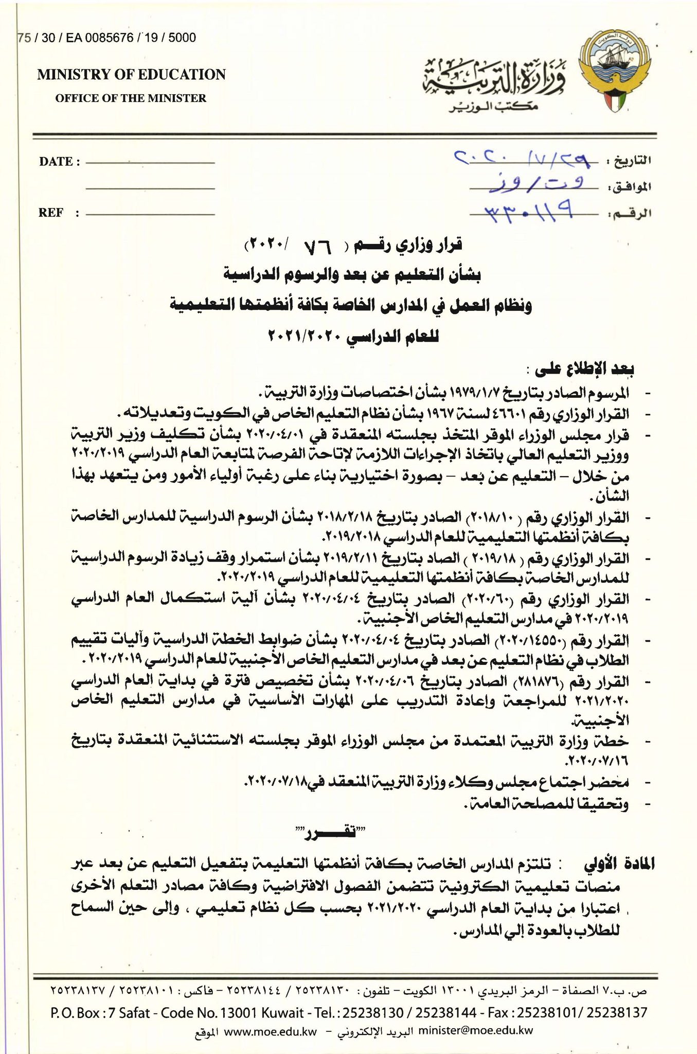 جريدة الأخبار الإلكترونية الكويتية الكويت التعليم الخاص قرار وزاري رقم 76 2020 بشأن التعليم عن بعد والرسوم الدراسية ونظام العمل في المدارس الخاصة بكافة أنظمتها التعليمية للعام الدراسي 2020 2021